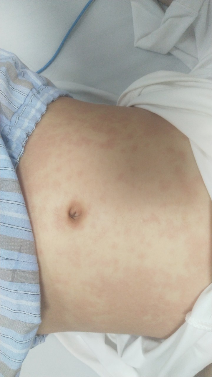 Được 2 tuần, bệnh nhi đột ngột sốt cao 40 độ C, rét run, phát ban toàn thân, kết mạc mắt đỏ, sưng nề mi mắt, lưỡi đỏ, mệt nhiều. Em được gia đình đưa vào viện.