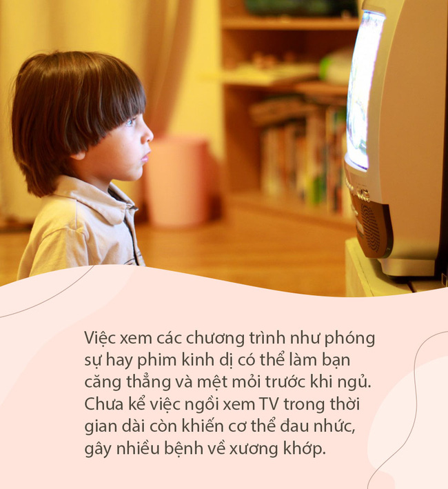 Cụ thể, việc xem các chương trình như phóng sự hay phim kinh dị có thể làm bạn căng thẳng và mệt mỏi trước khi ngủ. Chưa kể việc ngồi xem TV trong thời gian dài còn khiến cơ thể đau nhức, gây nhiều bệnh về xương khớp. Hãy hạn chế xem TV lại và thay bằng tập yoga hoặc tắm nước ấm cho đầu óc thư giãn.