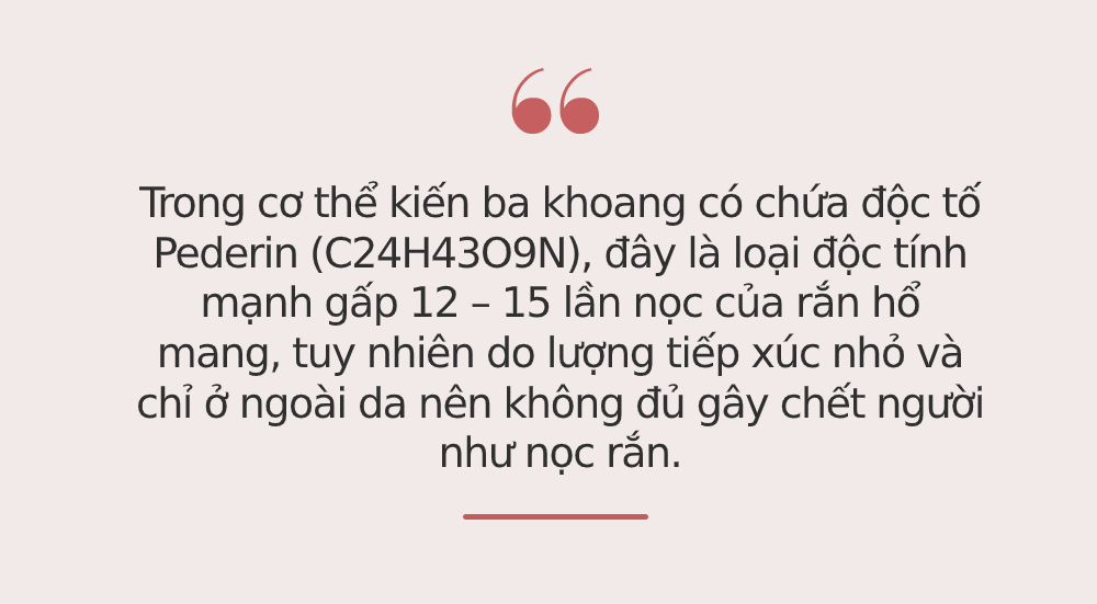 TS. BS Lê Ngọc Duy, Trung tâm cấp cứu và chống độc (Bệnh viện Nhi Trung ương) cho biết, trong cơ thể kiến ba khoang có chứa độc tố Pederin (C24H43O9N), đây là loại độc tính mạnh gấp 12 – 15 lần nọc của rắn hổ mang, tuy nhiên do lượng tiếp xúc nhỏ và chỉ ở ngoài da nên không đủ gây chết người như nọc rắn. Theo bác sĩ Duy, Pederin chủ yếu gây bỏng da có thể nhầm với tổn thương trong bệnh zona thần kinh.