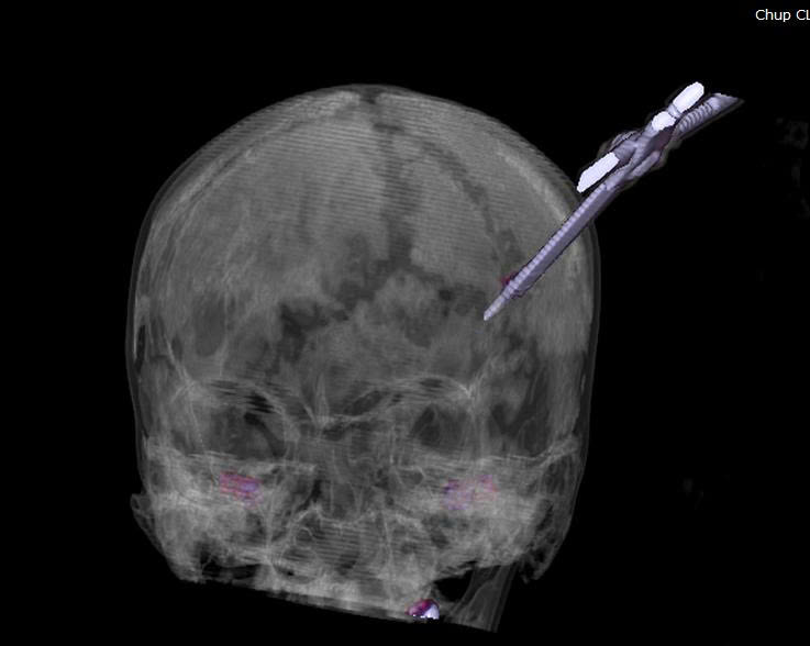 Dưới sự chỉ đạo trực tiếp của Bs.CKII Nguyễn Tiến Dũng, Phó Giám đốc Bệnh viện, kíp mổ hội chẩn với các chuyên khoa đánh giá đây là vết thương xuyên sọ sâu khoảng 5 cm xâm lấn nhu mô não, nguy cơ chảy máu sâu bên trong não kèm nguy cơ nhiễm trùng lan rộng do dị vật găm xuyên sọ, vì vậy bệnh nhân lập tức được chuyển phòng mổ cấp cứu lấy dị vật, xử trí tổn thương não cho người bệnh.