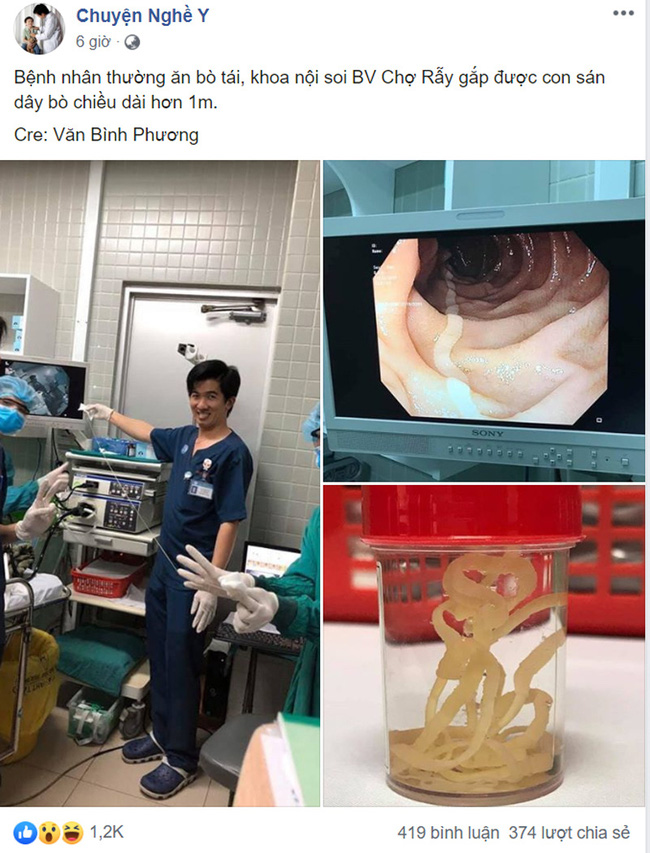 Mới đây, trên mạng xã hội đang truyền tay nhau hình ảnh bác sĩ cùng y tá cùng nhau căng một con sán dây dài hơn 1m. Theo nguồn thông tin chia sẻ, bệnh nhân này thường ăn bò tái và bị sán dây bò làm tổ. Bệnh nhân phải đến khoa nội soi Bệnh viện Chợ Rẫy để nhờ các bác sĩ gắp ra con sán dây bò dày hơn 1m.
