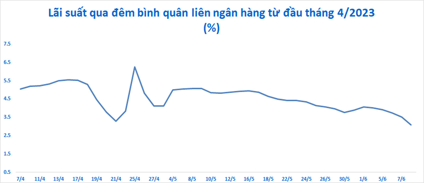 Trên thị trường liên ngân hàng, lãi suất cho vay qua đêm giảm mạnh, từ mức gần 6,3% hồi cuối tháng 4 xuống mức 3-,35%/năm như hiện tại và thấp hơn rất nhiều mức đỉnh 8,44% ghi nhận hồi đầu tháng 10/2022.