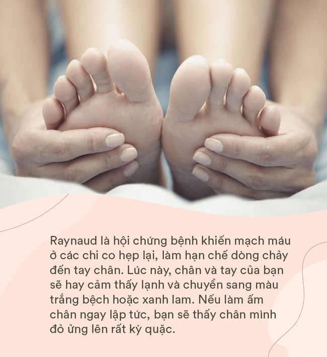 Raynaud là hội chứng bệnh khiến mạch máu ở các chi co hẹp lại, làm hạn chế dòng chảy đến tay chân. Lúc này, chân và tay của bạn sẽ hay cảm thấy lạnh và chuyển sang màu trắng hoặc xanh lam. Nếu làm ấm chân ngay lập tức, bạn sẽ thấy chân mình đỏ ửng lên rất kỳ quặc.