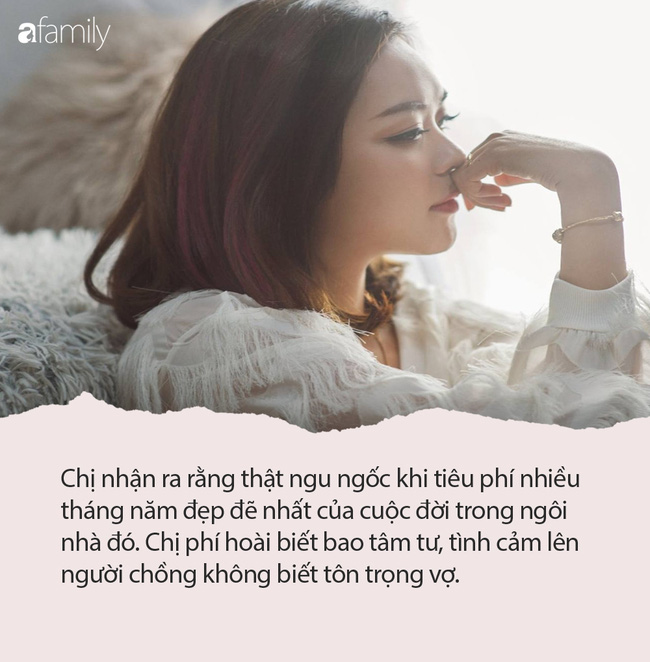 Chị nhận ra rằng thật ngu ngốc khi tiêu phí nhiều tháng năm đẹp đẽ nhất của cuộc đời trong ngôi nhà đó. Chị phí hoài biết bao tâm tư, tình cảm lên người chồng không biết tôn trọng vợ. Chị đã đưa ra những lời khuyên dành cho những phụ nữ trẻ tuổi, hãy nên mạnh dạn ly hôn nếu rơi vào những tình huống sau. Phụ nữ, hãy thôi chịu đựng đi.