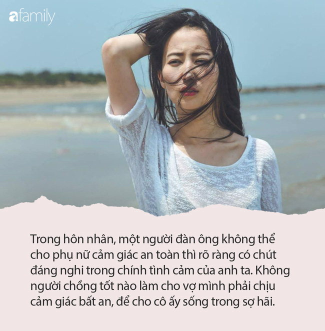 Trong hôn nhân, một người đàn ông không thể cho phụ nữ cảm giác an toàn thì rõ ràng có chút đáng nghi trong chính tình cảm của anh ta. Không có người chồng tốt nào làm cho vợ mình phải chịu cảm giác bất an, để cho cô ấy sống trong sợ hãi cả.