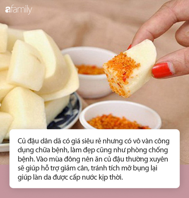 Theo lương y Vũ Quốc Trung, củ đậu dân dã có giá siêu rẻ dù là chính vụ hay ngoài vụ nhưng có vô vàn công dụng chữa bệnh, làm đẹp cũng như phòng chống bệnh. Vào mùa đông nên ăn củ đậu thường xuyên sẽ giúp hỗ trợ giảm cân, tránh tích mỡ bụng lại giúp làn da được cấp nước kịp thời.