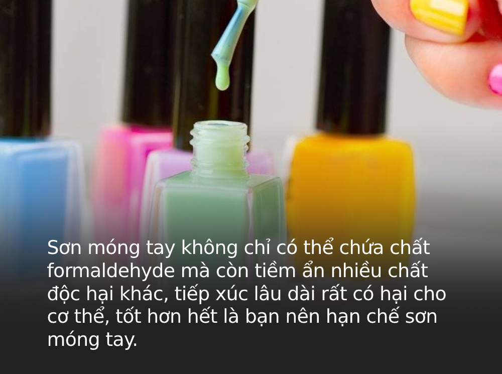 Cơ quan Bảo vệ Môi trường thuộc bang California, Mỹ đã tiến hành kiểm tra ngẫu nhiên các loại sơn móng tay trong khu vực. Kết quả là 12 trong số 25 sản phẩm được kiểm tra có chứa formaldehyde. Sơn móng tay không chỉ có thể chứa chất formaldehyde mà còn tiềm ẩn nhiều chất độc hại khác, tiếp xúc lâu dài rất có hại cho cơ thể, tốt hơn hết là bạn nên hạn chế sơn móng tay.