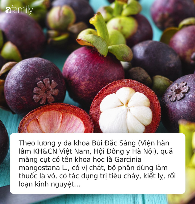 Theo lương y đa khoa Bùi Đắc Sáng (Viện hàn lâm KH&CN Việt Nam, Hội Đông y Hà Nội), quả măng cụt có tên khoa học là Garcinia mangostana L., có vị chát, bộ phận dùng làm thuốc là vỏ, có tác dụng trị tiêu chảy, kiết lỵ, rối loạn kinh nguyệt…