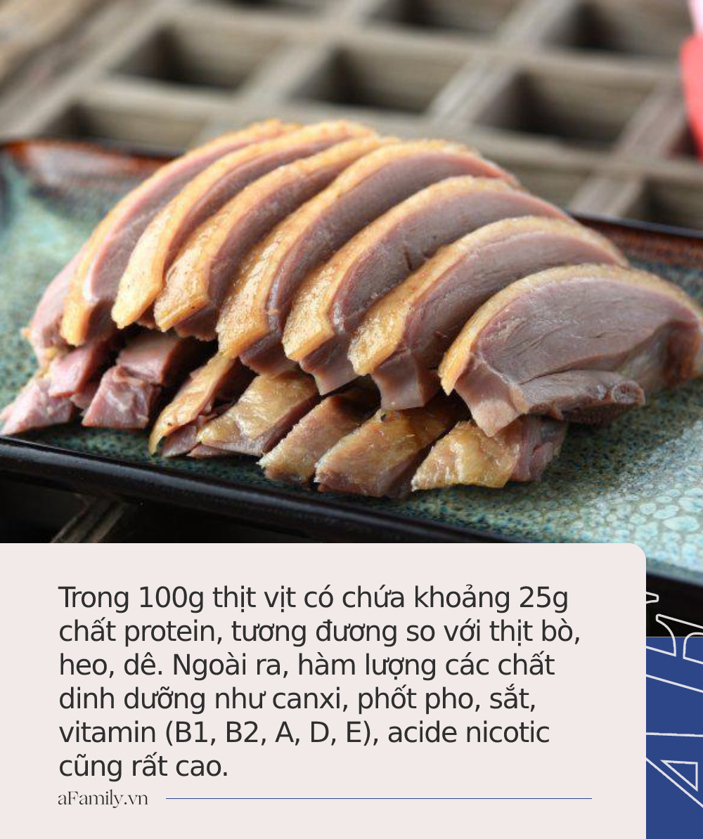 Vịt không chỉ ngon mà còn cung cấp đầy đủ dinh dưỡng cho gia đình bạn. Nghiên cứu cho thấy, trong 100g thịt vịt có chứa khoảng 25g chất protein, tương đương so với thịt bò, heo, dê. Ngoài ra, hàm lượng các chất dinh dưỡng như canxi, phốt pho, sắt, vitamin (B1, B2, A, D, E), acide nicotic cũng rất cao.