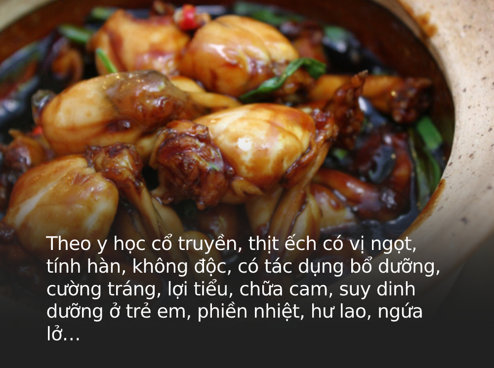 Ếch không chỉ là thực phẩm dân dã, ngon miệng mà còn được trọng dụng vì có giá trị dinh dưỡng cao và có tác dụng chữa bệnh. Theo y học cổ truyền, thịt ếch có vị ngọt, tính hàn, không độc, có tác dụng bổ dưỡng, cường tráng, lợi tiểu, chữa cam, suy dinh dưỡng ở trẻ em, phiền nhiệt, hư lao, ngứa lở…