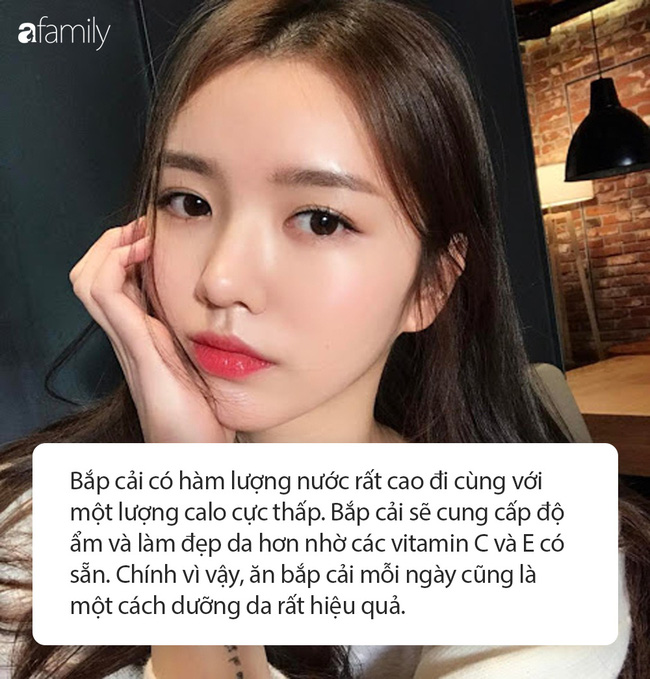 Bắp cải có hàm lượng nước rất cao đi cùng với lượng calo thấp. Chính vì vậy, ăn bắp cải mỗi ngày cũng là một cách dưỡng da rất hiệu quả. Bắp cải sẽ cung cấp độ ẩm và làm đẹp da hơn nhờ các vitamin C và E có sẵn. Nhiều chuyên gia thẩm mỹ cho biết, ăn bắp cải có tác dụng gần như ngang ngửa với việc đắp các loại mặt nạ dưỡng da đắt tiền.