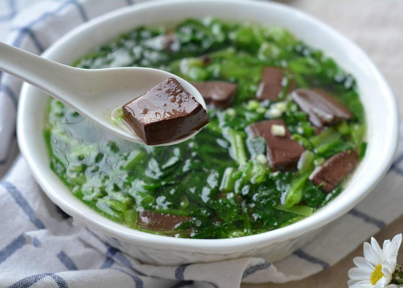 Cách làm: Dùng 250g tiết lợn đem đi luộc nhỏ lửa. Khi chín thì vớt ra, thái lát rồi cho lại vào nồi cùng 500g cải bó xôi và nấu thành canh. Sau khi canh chín, nêm nếp thêm bằng chút dầu, muối. Món ăn này có tác dụng nhuận tràng, thông đại tiện, bổ máu.