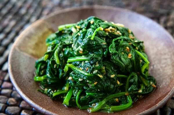 Cách làm: Dùng cải bó xôi tươi 250g, cho vào nước sôi ngâm trong vòng 3 phút, sau đó vớt ra trộn với muối, dầu vừng. Mỗi ngày ăn hai lần.