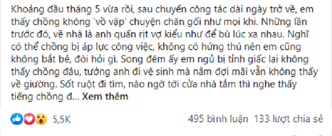 Câu chuyện như sau: "Khoảng đầu tháng 5 vừa rồi, sau chuyến công tác dài ngày trở về, em thấy chồng không 'vồ vập' chuyện chăn gối như mọi khi. Những lần trước đó, về nhà là anh quấn rịt vợ kiểu như để bù lúc xa nhau. Nghĩ có thể chồng bị áp lực công việc, không có hứng thú nên em cũng không bắt bẻ, đòi hỏi gì. Song đêm ấy em ngủ bị tỉnh giấc lại không thấy chồng đâu, tưởng anh đi vệ sinh mà nằm đợi mãi vẫn không thấy về giường. Sốt ruột đi tìm, nào ngờ tới cửa nhà tắm thì nghe thấy tiếng chồng đang thì thụt nói chuyện điện thoại bên trong: 'Ngủ đi tình yêu của anh. Sang tuần anh sẽ qua với em vài ngày'.