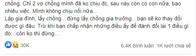 Đây là những lời tâm sự của cô vợ về sự khổ sở khi cưới phải ông chồng gia trưởng. Bài đăng thu hút đến 30 nghìn like. Người đàn ông trong câu chuyện thật sự đáng sợ vì những suy nghĩ và hành động của anh ta. Ông chồng này hoàn toàn không có chút trách nhiệm nào với cuộc hôn nhân của mình, điều gì cũng o ép vợ thực hiện còn bản thân thì thoải mái.