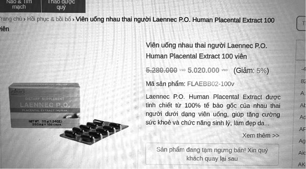 Một trang web khác có địa chỉ giao dịch trên đường Trần Đình Xu, quận 1 cũng rao bán loại thuốc nhau thai có tên Laennec P.O Human dạng viên nén, giá hơn 5 triệu đồng/hộp, và “nổ”: “Tinh chất nhau thai người được sản xuất, đóng gói từ Nhật Bản, sản phẩm có thế mạnh giúp tăng cường sinh lý, bản lĩnh đàn ông!”. Lần theo số điện thoại, khi chúng tôi hỏi mua hàng thì được báo là hàng đã hết, không có sẵn. Nếu muốn mua phải đặt cọc trước để làm tin thì mới nhập về, khi nghe chúng tôi do dự người này tiếp tục “nổ” thêm “Ngoài việc tăng cường sinh lý, thuốc này còn đặc trị các bệnh khó chữa về gan như gan nhiễm mỡ, viêm gan...”