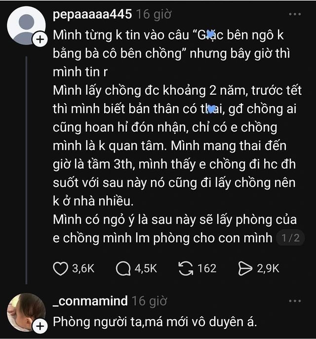Theo chia sẻ của người trong cuộc, cô kết hôn được khoảng hai năm và mới phát hiện mang thai trước dịp Tết. Tin vui này khiến gia đình chồng rất phấn khởi. Tuy nhiên, cô nhận thấy em chồng không tỏ ra quá quan tâm. Vì thấy em chồng đang học đại học và ít khi ở nhà, người chị dâu đã ngỏ ý rằng sau này có thể sử dụng căn phòng của em làm phòng cho đứa trẻ.