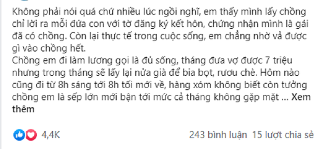 "Không phải nói quá chứ nhiều lúc ngồi nghĩ, em thấy mình lấy chồng chỉ lời ra mỗi đứa con với tờ đăng ký kết hôn, chứng nhận mình là gái đã có chồng. Còn lại thực tế trong cuộc sống, em chẳng nhờ vả được gì vào chồng hết.