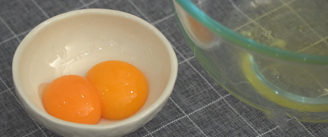 Đầu tiên bạn tách riêng lòng trắng trứng và lòng đỏ trứng ra hai bát khác nhau. Nhớ đừng để lòng đỏ dính vào lòng trắng, lòng đỏ dính vào lòng trắng sẽ khiến lòng trắng không thể bông nhiều lên được đấy.