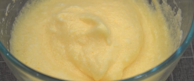 Tiếp đến, bạn cho từ từ lòng đỏ vào lòng trắng đã được đánh bông, rồi dùng phới nhẹ nhàng trộn hỗn hợp từ dưới lên cho đều với nhau.