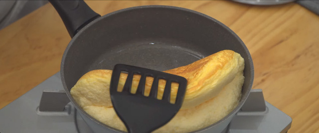 Sau 3 - 4 phút đế trứng vàng rồi thì bạn nhẹ nhàng gập trứng lại như bánh xèo.