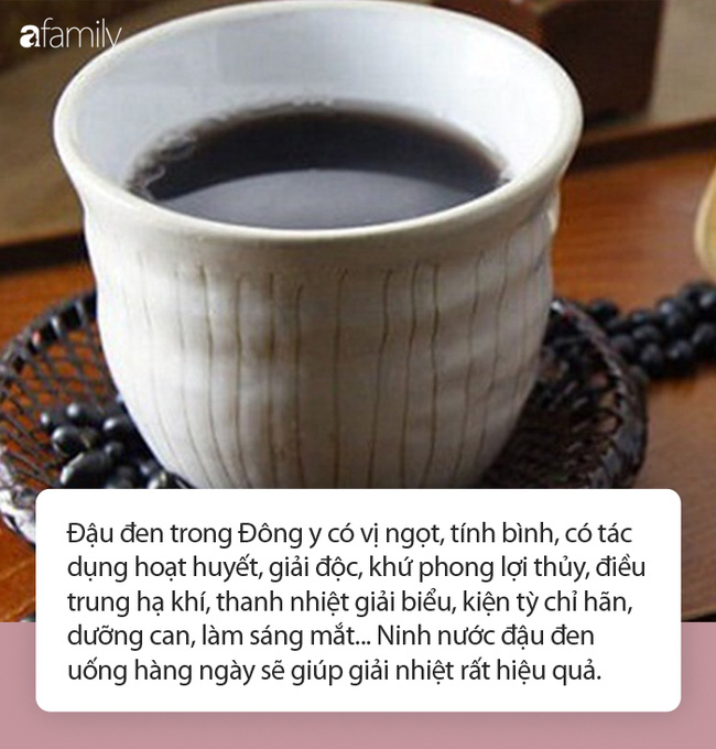Theo lương y Bùi Hồng Minh (Nguyên Chủ tịch Hội Đông y Ba Đình, Hà Nội), đậu đen trong Đông y có vị ngọt, tính bình, có tác dụng hoạt huyết, giải độc, khứ phong lợi thủy, điều trung hạ khí, thanh nhiệt giải biểu, kiện tỳ chỉ hãn, dưỡng can, làm sáng mắt... Đậu đen cũng được sử dụng điều trị các bệnh lý về phong nhiệt rất tốt, ngoài ra đậu đen còn có thể kết hợp với một số vị thuốc Đông y khác để điều trị bệnh… Do đó, ninh nước đậu đen uống hàng ngày sẽ giúp giải nhiệt trong những ngày nắng nóng cực điểm này rất hiệu quả.