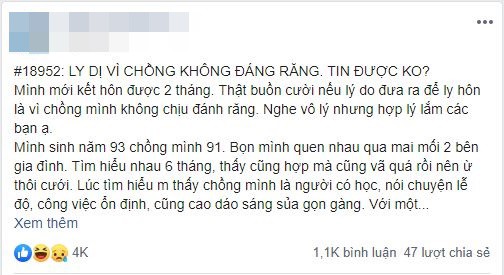 Và mới đây, một lý do ly hôn cũng bất ngờ không kém, khiến dân mạng bàn tán xôn xao là vì chồng không chịu đánh răng.