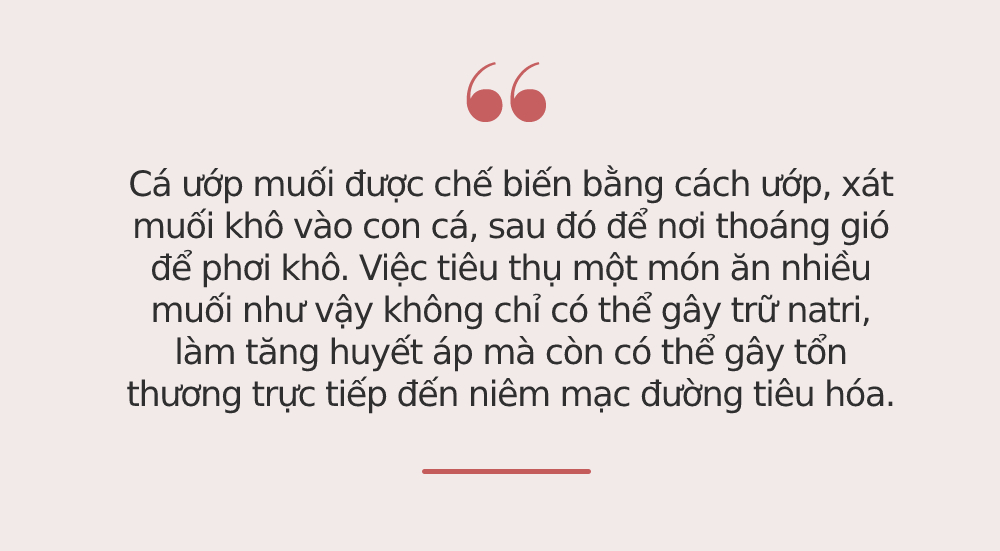 Theo tờ QQ phân tích, cá ướp muối được chế biến bằng cách ướp, xát muối khô vào con cá, sau đó để nơi thoáng gió để phơi khô. Việc tiêu thụ một món ăn nhiều muối như vậy không chỉ có thể gây trữ natri, làm tăng huyết áp mà còn có thể gây tổn thương trực tiếp đến niêm mạc đường tiêu hóa, dẫn đến các bệnh tiêu hóa mãn tính xảy ra, bao gồm viêm, loét và tăng nguy cơ ung thư dạ dày.