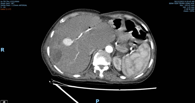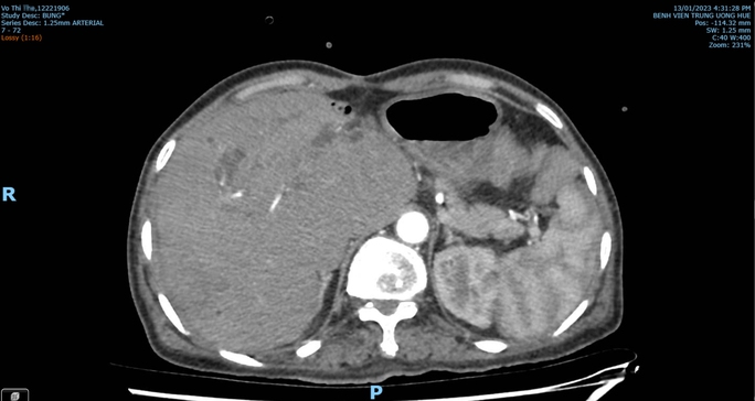 Bà Th. nhập viện vào cuối tháng 12-2022 với tình trạng sốt cao, đau hạ sườn phải. Kết quả CT Scan bụng cho thấy hình ảnh áp-xe gan và khối giả phình động mạch ở gan phải.