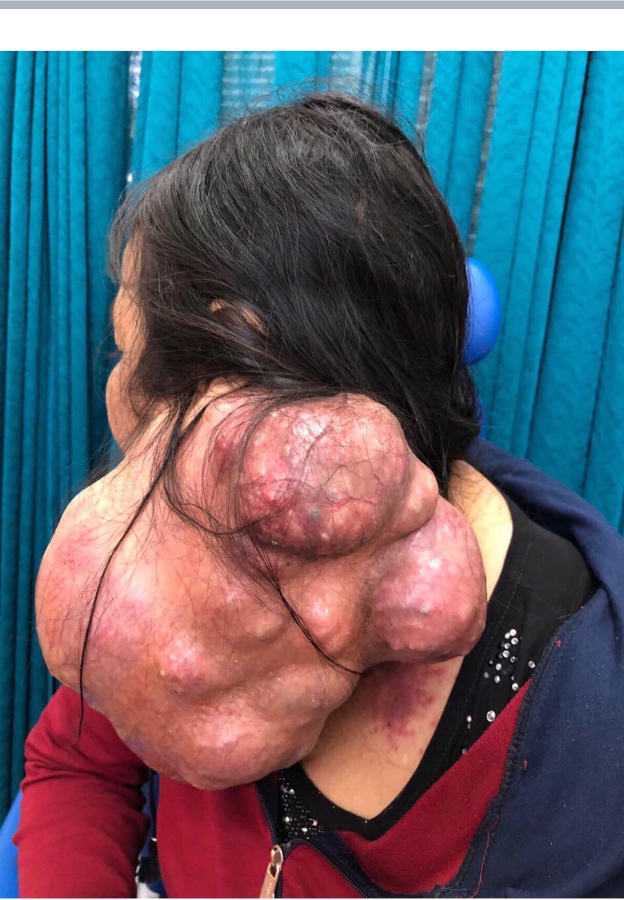 Đó là bệnh nhân Trần Thị Hường, SN 1972, ngụ Long An đã mang khối u ở vùng cổ trái khoảng 25 năm. Trước đó, bệnh nhân đã được phẫu thuật lấy u cổ 1 lần.