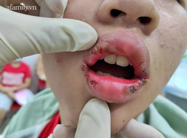Sau khi sử dụng không lâu thì thiếu nữ bị biến chứng nặng ở môi khiến việc ăn uống, giao tiếp rất khó khăn.