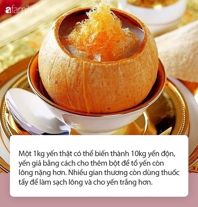 Theo giới chuyên gia, thị trường yến sào có thể nói rất loạn giá. Một 1kg yến thật có thể biến thành 10kg yến độn, yến giả bằng cách cho thêm bột để tổ yến còn lông nặng hơn. Nhiều gian thương còn dùng thuốc tẩy để làm sạch lông và cho yến trắng hơn. Ngoài ra, nhiều gian thương cũng có thể sẽ dùng phẩm màu, hóa chất độc hại để bảo quản, giúp yến sào trông đẹp mắt hơn. Chưa kể, nhiều đại lý, người bán còn nhập khẩu yến sào giá rẻ từ nước ngoài có chất lượng kém hơn, làm giả yến Việt Nam với giá cao ngất. Do đó, người tiêu dùng cần hết sức cẩn trọng khi mua yến sào, tránh tiền mất tật mang.