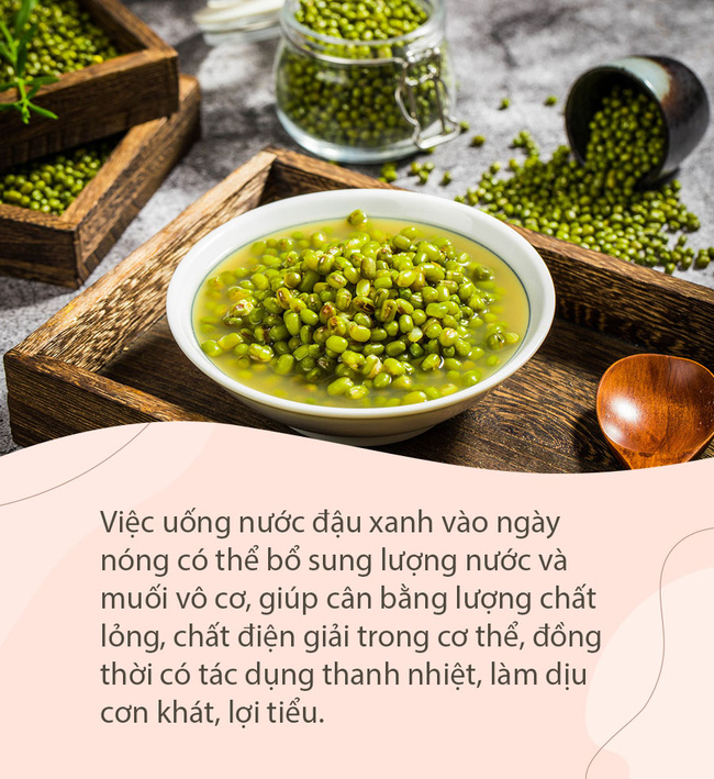 Thời tiết nắng nóng khiến con người dễ ra mồ hôi nhiều, điều này cũng dẫn tới việc cơ thể mất nước, mất cân bằng điện giải. Việc uống nước đậu xanh lúc này có thể bổ sung lượng nước và muối vô cơ, giúp cân bằng lượng chất lỏng và chất điện giải trong cơ thể, đồng thời có tác dụng thanh nhiệt, làm dịu cơn khát, lợi tiểu.