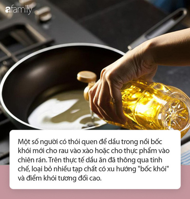 Một số người có thói quen để dầu trong nồi bốc khói mới cho rau vào xào hoặc cho thực phẩm vào chiên rán. Trên thực tế dầu ăn đã thông qua tinh chế, loại bỏ nhiều tạp chất có xu hướng "bốc khói" và điểm khói tương đối cao.