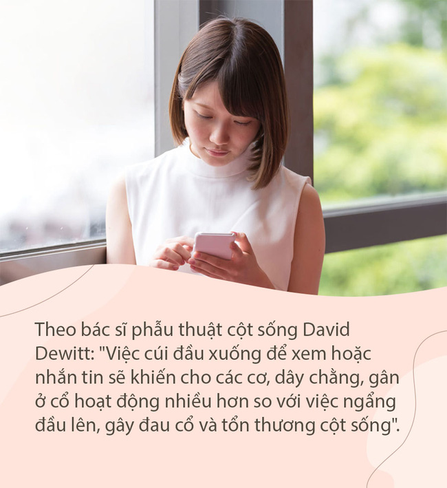 Việc thường xuyên cúi đầu nhìn xuống điện thoại trong thời gian dài sẽ gây tổn thương cột sống cổ. Theo bác sĩ phẫu thuật cột sống David Dewitt tại Trung tâm Y tế NeuroSpine, Wisconsin, Mỹ: "Việc cúi đầu xuống để xem hoặc nhắn tin sẽ khiến cho các cơ, dây chằng, gân ở cổ hoạt động nhiều hơn so với việc ngẩng đầu lên. Theo thời gian, sự kéo căng này sẽ làm suy yếu sức mạnh của các cơ, gây đau cổ và tổn thương cột sống cổ".