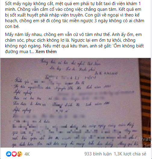 Câu chuyện như sau: "Sốt mấy ngày không cắt, mệt quá em phải tự bắt taxi đi viện khám 1 mình. Chồng vẫn cắm cổ vào công việc chẳng quan tâm. Kết quả em bị sốt xuất huyết phải nhập viện truyền. Con gửi về ngoại vì theo kế hoạch, chồng em sẽ đi công tác miền ngược 3 ngày không có ai chăm con bé.