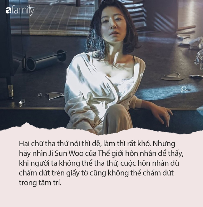 Hai chữ tha thứ nói thì dễ, làm thì rất khó. Nhưng hãy nhìn Ji Sun Woo của Thế giới hôn nhân để thấy, khi người ta không thể tha thứ, cuộc hôn nhân dù chấm dứt trên giấy tờ cũng không thể chấm dứt trong tâm trí. Ta phải gánh chịu hậu quả đau đớn nhường nào. Con cái của ta phải chịu những vết thương sâu thế nào. Lòng căm hận trước khi tiêu diệt được kẻ thù thì đã đốt cháy chính mình.