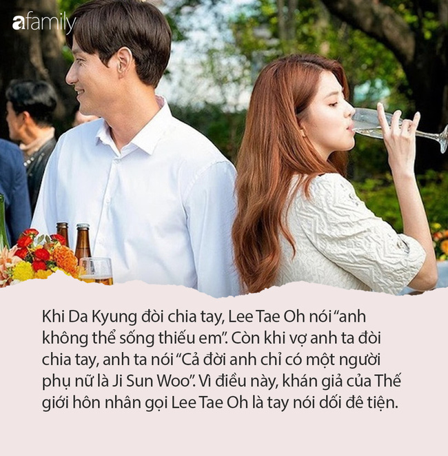 Khi Da Kyung đòi chia tay, Lee Tae Oh nói “anh không thể sống thiếu em”. Còn khi vợ anh ta đòi chia tay, anh ta nói “Cả đời anh chỉ có một người phụ nữ là Ji Sun Woo”. Vì điều này, khán giả của Thế giới hôn nhân gọi Lee Tae Oh là tay nói dối đê tiện. Nhưng buồn là, phần đa đàn ông trên trái đất này đều là những tay nói dối đê tiện nếu như họ lỡ sa chân vào chuyện ngoại tình.