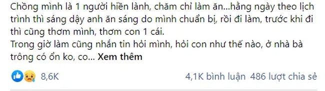Chồng mình là 1 người hiền lành, chăm chỉ làm ăn. Hằng ngày theo lịch trình thì sáng dậy anh ăn sáng do mình chuẩn bị, rồi đi làm, trước khi đi thì cũng thơm mình, thơm con 1 cái.