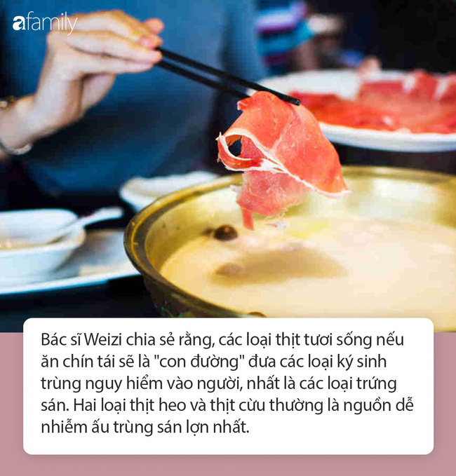 Bác sĩ Weizi chia sẻ rằng, rất có thể ông Tan đã ăn lẩu tươi sống không chín kỹ nên mới mắc giun sán. Cụ thể, các loại thịt tươi sống nếu ăn chín tái sẽ là "con đường" đưa các loại ký sinh trùng nguy hiểm vào người, nhất là các loại trứng sán. Hai loại thịt heo và thịt cừu thường là nguồn dễ nhiễm ấu trùng sán lợn nhất.
