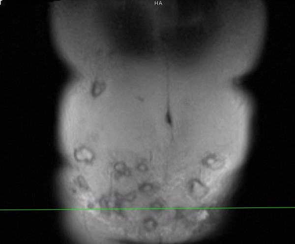 Bác sĩ Minh cho biết, vùng thành bụng bệnh nhân bị viêm phản ứng nặng, vùng da ngoài thành bụng đỏ, nổi gồ ghề, sờ bên dưới có hàng chục khối tổ chức vón cục, áp xe....