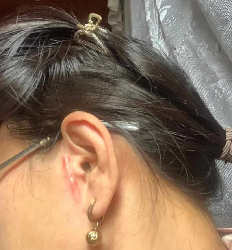 Theo bà H., vào thời điểm phẫu thuật, bác sĩ cơ sở thẩm mỹ T.K.X. cho biết dùng chỉ tự tiêu. Thế nhưng sau hơn 8 tháng, mí mắt của bà vẫn còn sót lại một đoạn chỉ. Ngoài ra, bà H. cho hay, sau 8 tháng, vết mổ kéo căng cơ mặt bị sẹo lồi, trông rất mất thẩm mỹ. Cơ sở thẩm mỹ này còn chặn số liên lạc của bà.