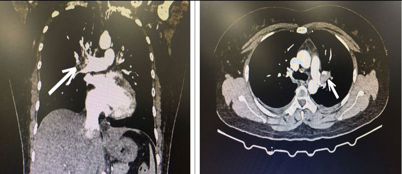 Bác sĩ cấp cứu hướng chẩn đoán tới bệnh thuyên tắc động mạch phổi cấp và quyết định cho chụp CT ngực có tiêm thuốc cản quang. Kết quả là hình ảnh huyết khối động mạch phổi 2 bên.