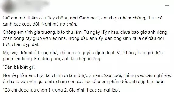 Nói về phần em, học tài chính đi làm được 3 năm. Sau cưới, chồng yêu cầu nghỉ việc ở nhà lo vun vén gia đình, chăm con cái. Lúc đầu em phản đối, anh đập bàn luôn: “Cô chỉ được lựa chọn 1 trong 2. Gia đình hoặc sự nghiệp”.