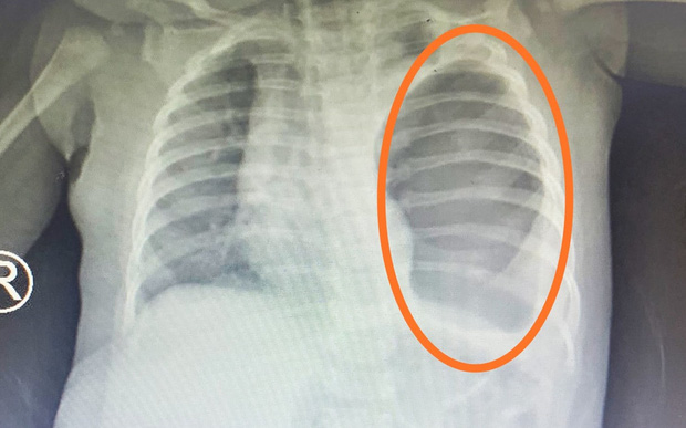 Tại bệnh viện, kết quả xét nghiệm, siêu âm ổ bụng và chụp X-quang của bé cho thấy: Hình ảnh dạ dày, quai ruột chiếm toàn bộ phổi trái, chèn ép đẩy lệch tim sang bên phải. Các bác sĩ chẩn đoán: bé bị thoát vị hoành, nếu không được mổ kịp thời để sắp xếp lại vị trí các tạng trong ổ bụng và lồng ngực, bé có thể tử vong bất kỳ lúc nào.