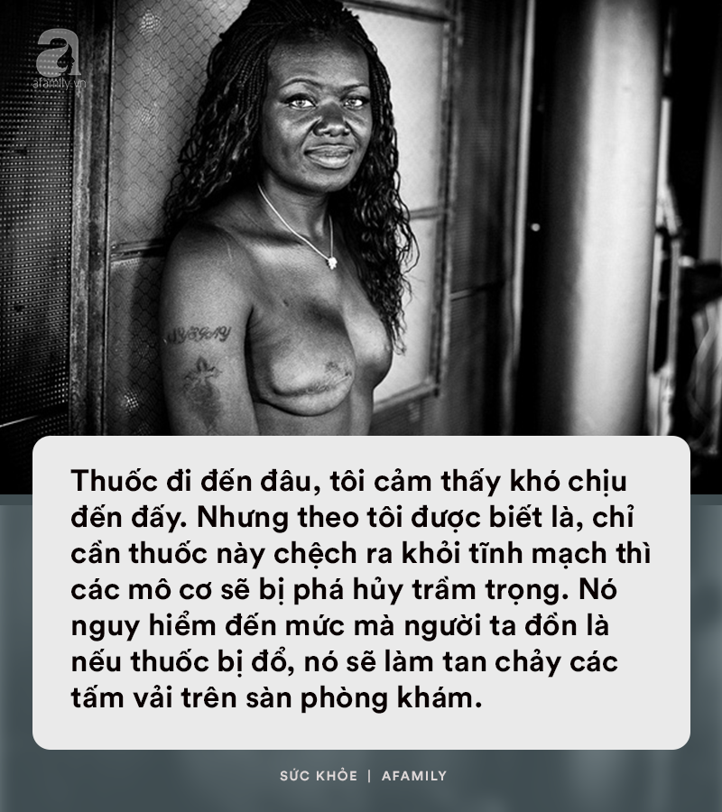 Thuốc đi đến đâu, tôi cảm thấy khó chịu đến đấy. Nhưng theo tôi được biết là, chỉ cần thuốc này chệch ra khỏi tĩnh mạch thì các mô cơ sẽ bị phá hủy trầm trọng. Nó nguy hiểm đến mức mà người ta đồn là nếu thuốc bị đổ, nó sẽ làm tan chảy các tấm vải trên sàn phòng khám. Trong vài ngày sau khi dùng thuốc thì cơ thể tôi đúng nghĩa là một chất độc, nó có thể gây hại cho chính người khác và cả bản thân mình.