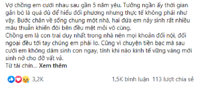 Chồng em là con trai duy nhất trong nhà nên mọi khoản đối nội, đối ngoại đều tới tay chúng em phải lo. Cũng vì chuyện tiền bạc mà sau cưới em không dám sinh con ngay, tính khi nào kinh tế vững vàng mới sinh nở cho đỡ vất vả.