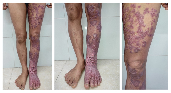 Tại thời điểm khám ở Bệnh viện Da liễu Trung ương, tổn thương là mảng sùi kích thước lớn chiếm toàn bộ mu chân, cẳng chân, lan đến đùi bẹn, tổn thương chắc, gây biến dạng toàn bộ mu chân và 1/3 dưới cẳng chân trái. Một số tổn thương chảy dịch, bốc mùi hôi, bệnh nhân đi lại khó khăn và hạn chế.