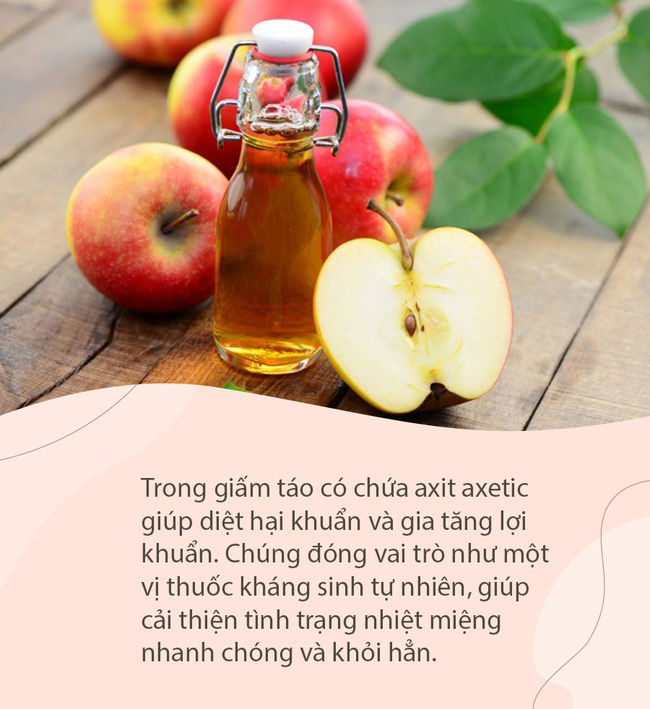 Trong giấm táo có chứa axit axetic giúp diệt hại khuẩn và gia tăng lợi khuẩn. Chúng đóng vai trò như một vị thuốc kháng sinh tự nhiên, giúp cải thiện tình trạng nhiệt miệng nhanh chóng. Chưa kể giấm táo cũng tăng tốc độ hồi phục vết thương, chỉ vài ngày thôi là thấy kết quả ngay.