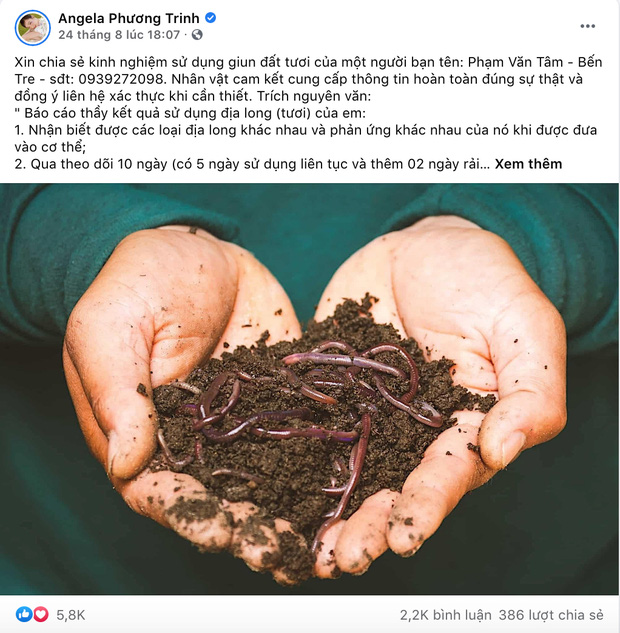 Cách đây không lâu, nữ diễn viên Angela Phương Trinh đã lan truyền thông tin về việc uống (nuốt) giun đất tươi (còn gọi là địa long) có rất nhiều công dụng với sức khoẻ, còn được xem là "thần dược". Cùng với đó, khá nhiều cư dân mạng cũng chia sẻ thông tin này, thậm chí còn có người nói rằng uống giun đất tươi có thể trị được Covid-19.
